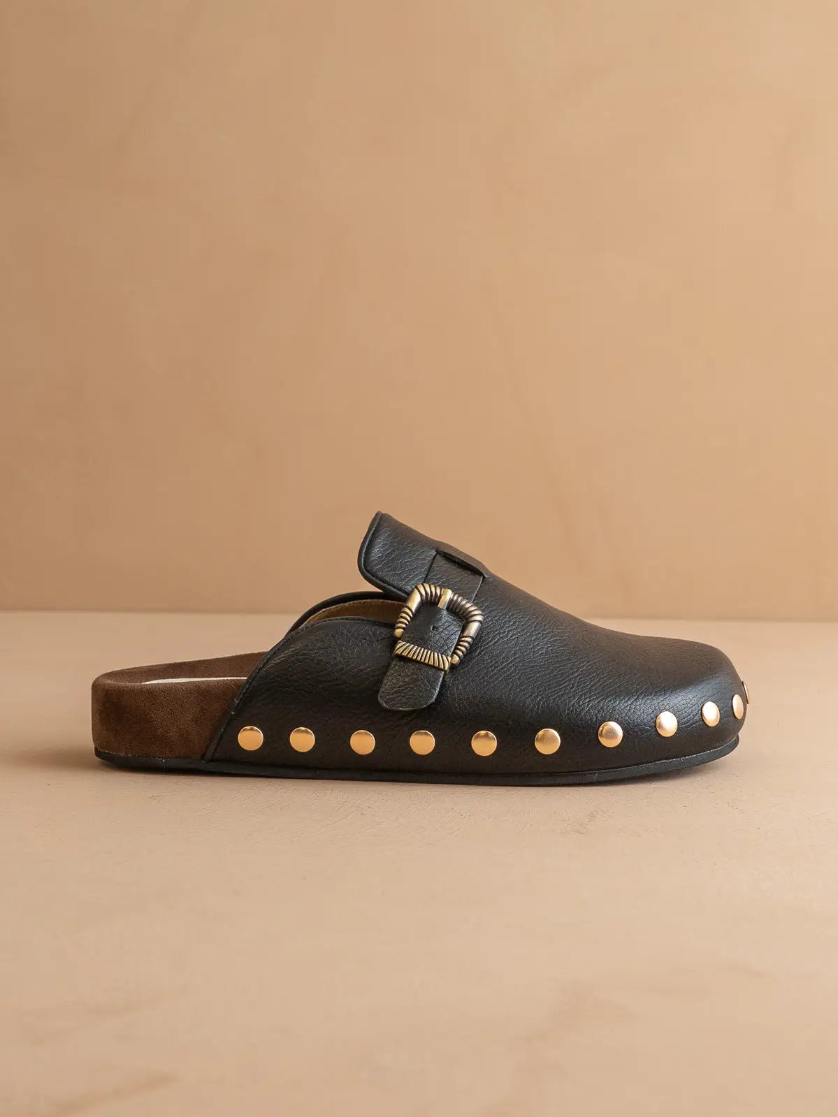 An everyday statement. The FLATZ updates the classic clog silhouette with gold dome studs, a vintage-inspired buckle, and a molded footbed that feels like a dream. Crafted from atelier-selected materials for that perfect balance of edge and ease. Materials: * Upper Material: Vegan Leather Upper * Insole Material: Vegan Suede Insole * Sole or Heel Material: Rubber Outsole