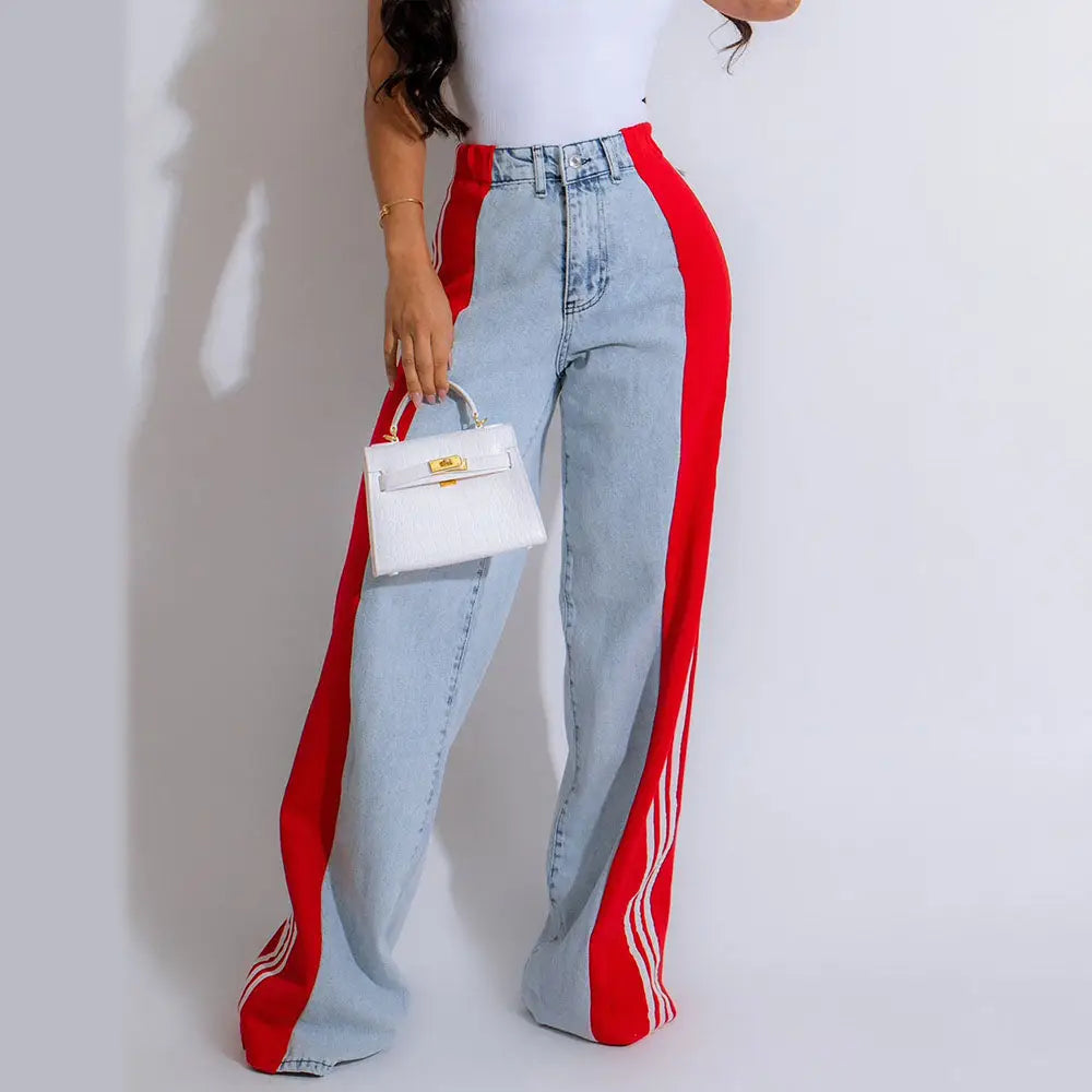 Stripes High Waisted Jeans for Women Color Block Floor Length Wide Leg Denim Pants Stretch Baggy Jeans Long Pants