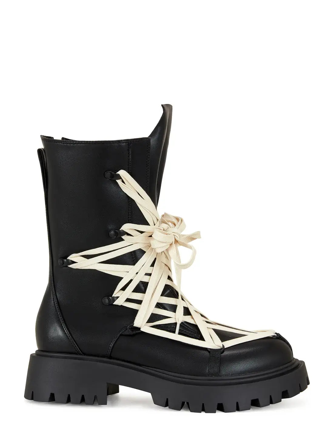 Made from black faux leather, these chunky combat boots make a statement with a unique white shoelace accent scattered over the front boot shaft. Perfect for adding an edgy touch to any outfit.